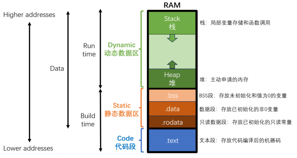 - 动态数据区(Dynamic Data Segment):包括堆(Heap)和栈(Stack),分别用于动态内存分配和函数调用时的局部变量存储。
